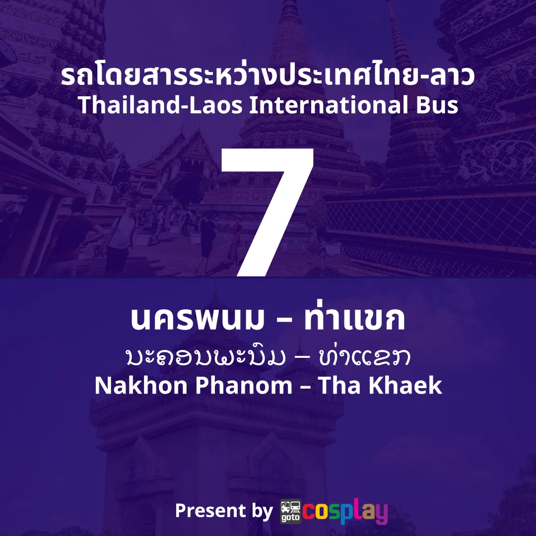 • หมวดเส้นทาง : รถโดยสารระหว่างประเทศ • สายที่ : 7 • ช่วงเส้นทาง : หนองคาย – นครหลวงเวียงจันทน์ • ผู้ประกอบการเดินรถ (เดินรถทั้ง 2 ประเทศ) บริษัท ขนส่ง จำกัด (บขส.) บริษัท เจริญสุขขนส่งโดยสาร จำกัด (สปป.ลาว)